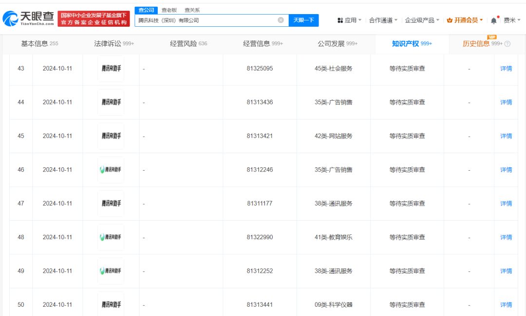 每经AI快讯,天眼查知识产权信息显示,近日,腾讯科技(深圳)有限公司申请注册多枚“腾讯AI助手”商标,国际分类包含社会服务、广告销售、网站服务等,当前商标状态均为等待实质审查。