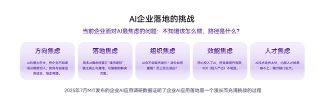 根据MIT 2025年7月发布的《The GenAI Divide——State of AI in Business》研究报告,企业AI应用普遍面临"高采用、低转化"的挑战:60%的组织评估过定制或采购企业级AI工具,但仅5%实现规模化推广应用。业务学习能力差距和业务适配能力差距成为企业AI内部应用受阻的两大鸿沟。