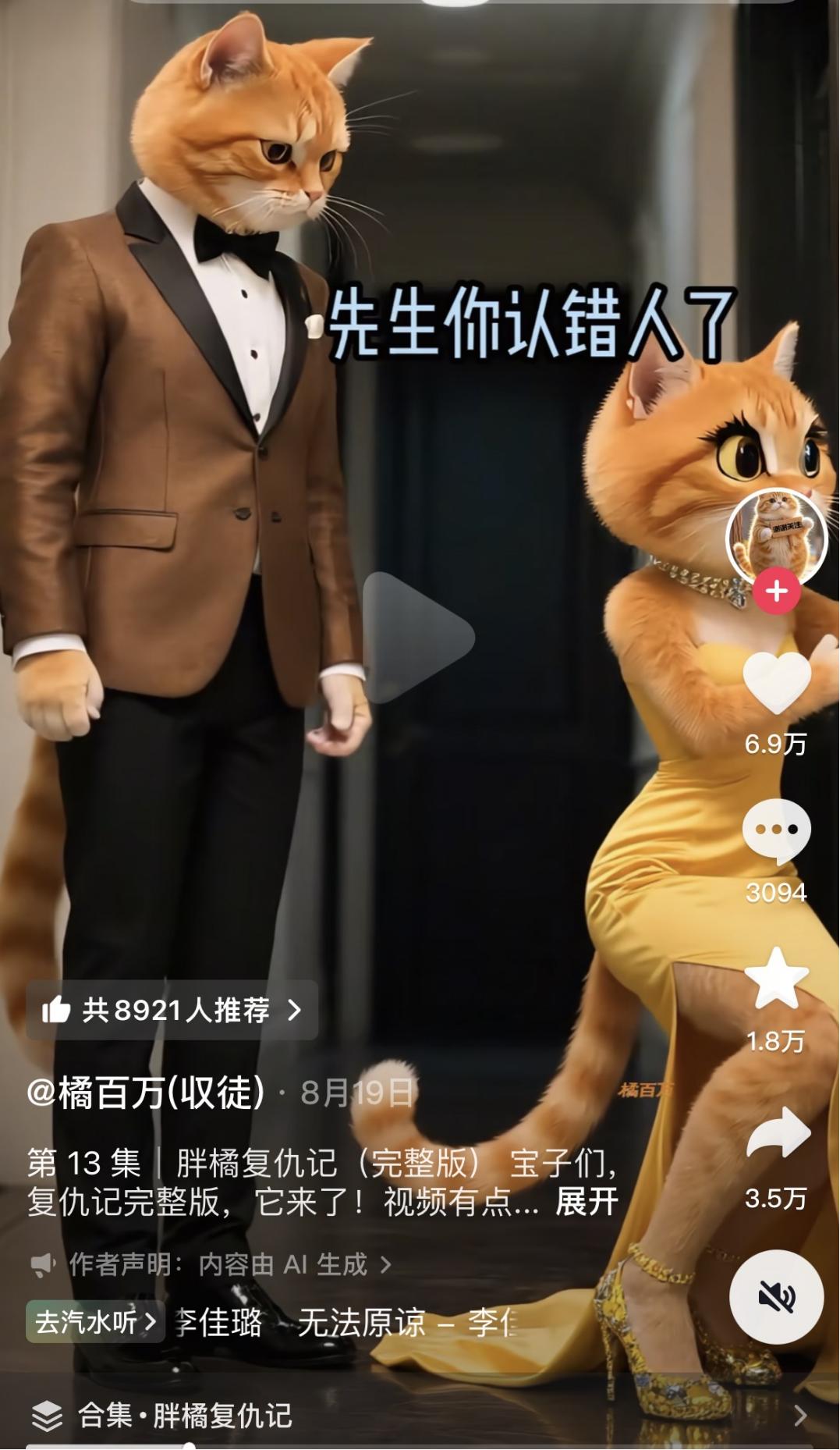 现实里只会围着食盆转、撒欢撒娇的毛孩子,一进 AI短剧就摇身变成了足智多谋的狠角色:大胖橘用小鱼干罐头摆出满汉全席设下陷阱,等老虎醉倒后,堂而皇之地剃下对方肚皮上的毛做成虎皮大衣,气得老虎只能原地狂怒;泰迪化身初入职场的新人,跟着前辈学写方案、应对难缠客户,摸索职场生存法则;还有背负家族使命的橘猫、勤工俭学替父母分忧的大橘…… 创作者们借助AI工具生成宠物虚拟形象,再用拟人化设定赋予它们鲜明的性格,反转不断又趣味十足的剧情,让许多年轻人深陷其中,直呼“太上头”。