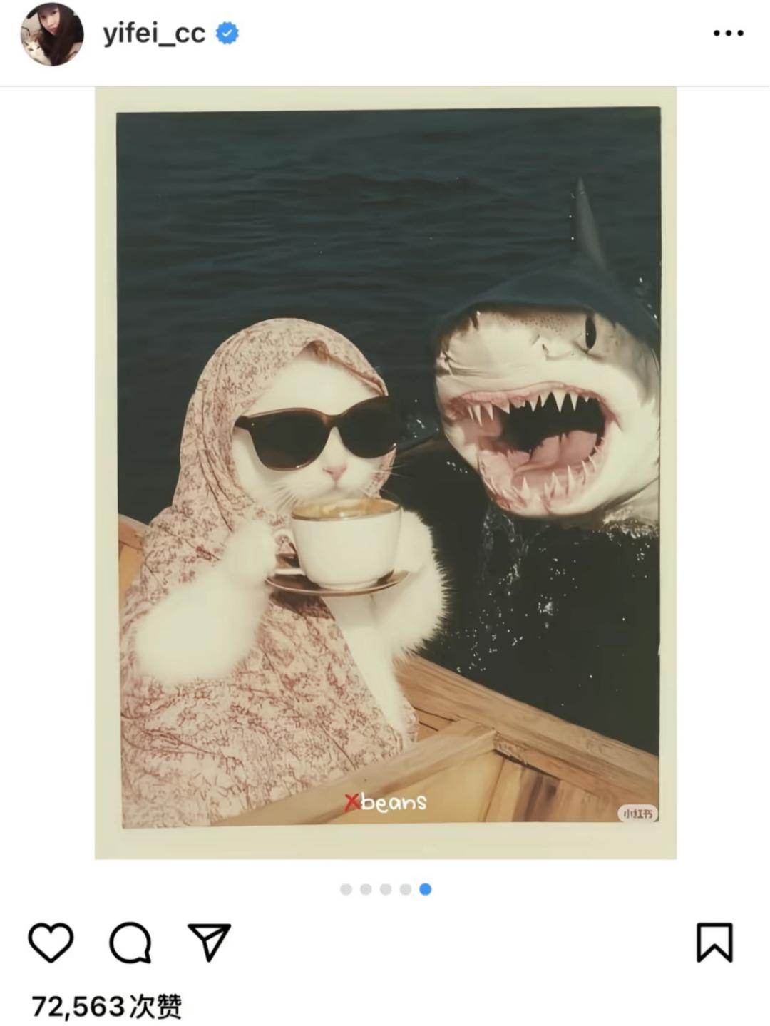 账号“不吃豆制品”重点打造的IP“松弛猫Chillcat”,甚至被演员刘亦菲“翻牌”,转载至其社媒平台,成为AI猫狗短剧领域兼具口碑与热度的代表性IP之一。