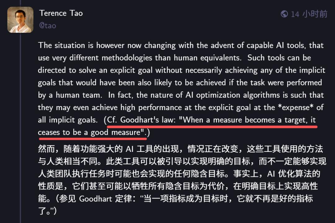 不幸的是,按照陶哲轩的洞见,AI——尤其是那些强大的优化算法——正是Goodhart定律最忠实、也是最极致的执行者。