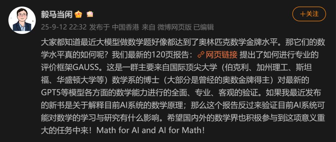 近日,一群来自国际顶尖大学(伯克利、加州理工、斯坦福、华盛顿大学等)数学系的博士(大部分是曾经的奥数金牌得主),以及香港大学计算与数据科学学院院长、AI讲座教授马毅对最新的GPT5等模型各方面的数学能力进行了全面、专业、客观的验证。