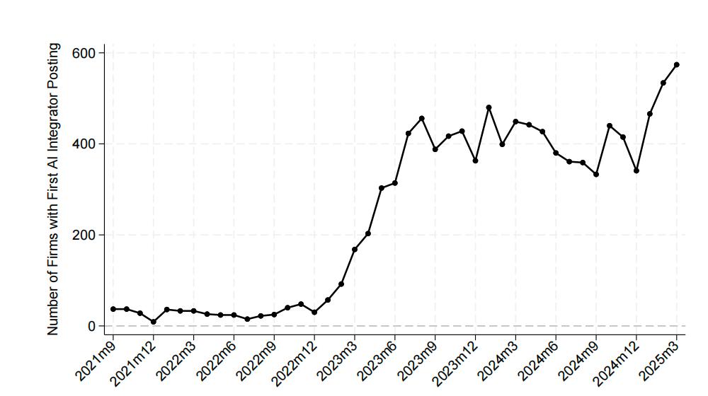 数据显示,与对照组相比,AI采纳者公司在2023年第一季度后,平均每个季度少招了3.7个初级员工。