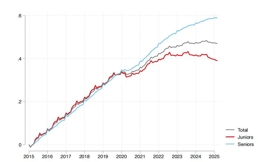 在这个行业里,拥抱AI的公司,其初级岗位的招聘数量比不拥抱AI的公司,每季度减少了将近40%。