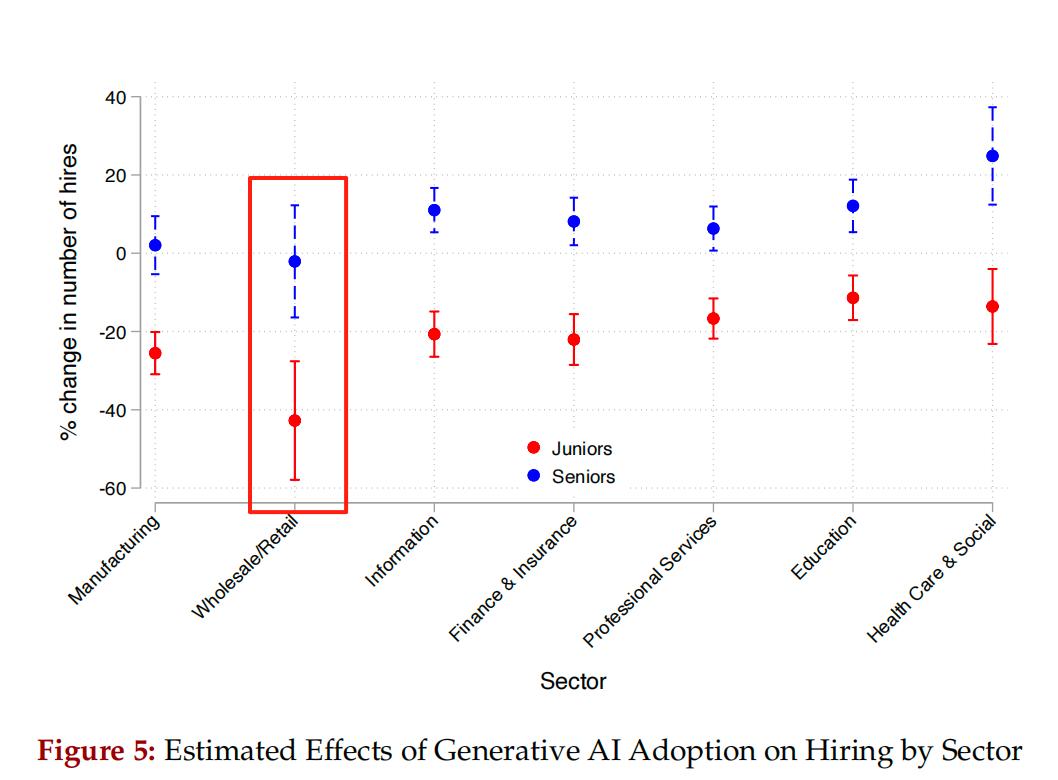 论文数据显示,这种对初级岗位的压缩效应,在所有行业都普遍存在,但程度不同。