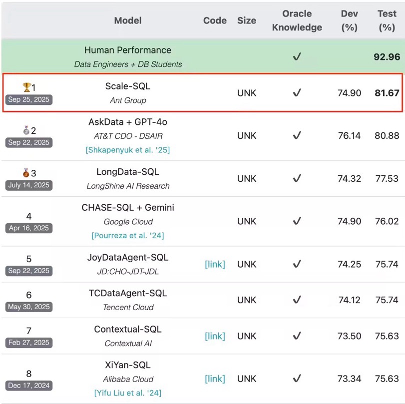 9月26日消息,据全球权威评测基准BIRD-Bech官网,蚂蚁数科的数据分析智能体Agentar-SQL超越AT&T(美国电话电报公司)、谷歌云、腾讯云、阿里云等诸多国内外厂商,位居全球第一。这也是中国公司在该榜单上取得的最高成绩。