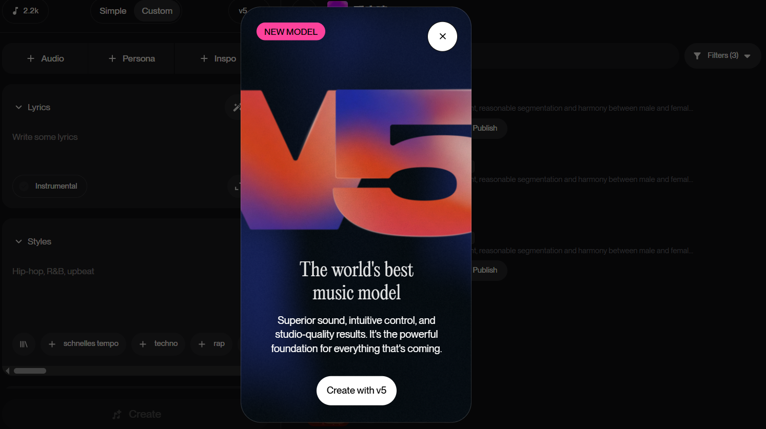 Suno v5在技术上进行了全面升级,预计将引入更先进的语义控制和多模态输入功能。这意味着用户可以通过自然语言精准调节音乐细节,甚至结合图像或语音提示来创作音乐,从而解决当前模型在复杂结构衔接与风格自然过渡方面的局限。此外,v5的灵感模式(Inspire Mode)也是一大亮点,仅需一段文字描述,就能生成风格鲜明、旋律流畅的音乐作品。