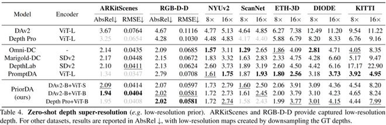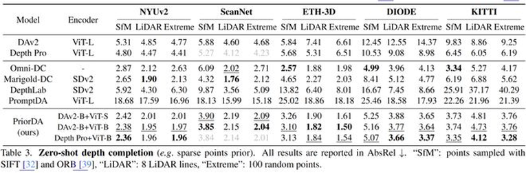 表 3展示了使用不同种类和稀疏性水平的稀疏点作为先验时的零样本深度补全结果。