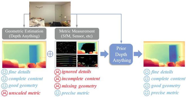 Prior Depth Anything提出逐步整合来自度量测量(准确度量)和相对预测(完整性和精细细节)的补充信息,以生成密集和细粒度的度量深度图。