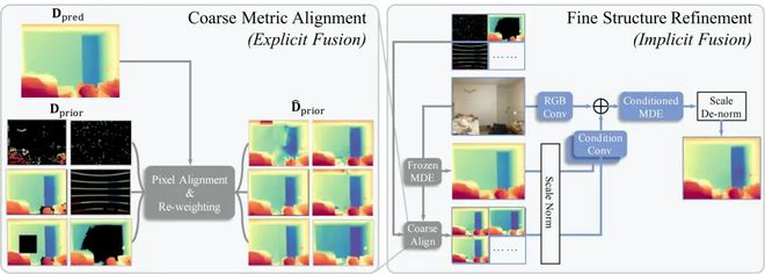 该方法通过粗到细的流程,先用像素级度量对齐将深度预测与先验融合,再利用条件化单目深度估计模型(conditioned-MDE)优化结果。