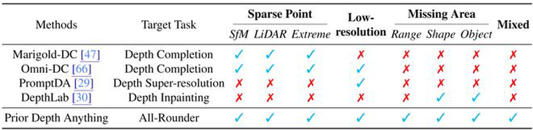 如图所示,不同类型的深度先验呈现出不同的缺失模式(例如稀疏点、低分辨率网格或不规则孔洞)。