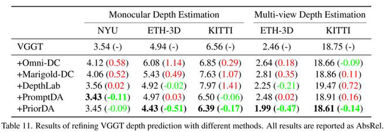 下表展示了VGGT在单目和多视角深度估计方面的性能,以及不同基于先验的方法作为细化器的有效性。