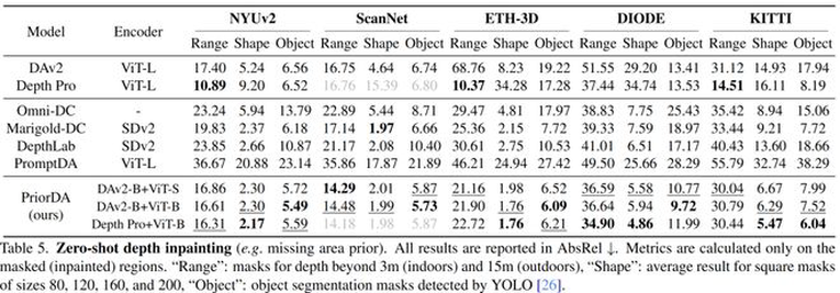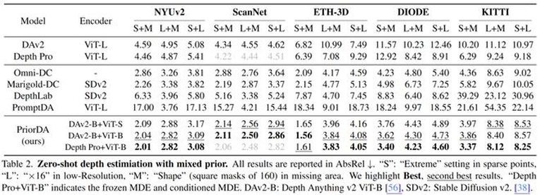 在表 2中定量评估了模型处理具有挑战性的未知混合先验的能力。就绝对性能而言,Prior Depth Anything的所有版本都优于对比基线。更重要的是,其受新模式深度先验的影响较小。