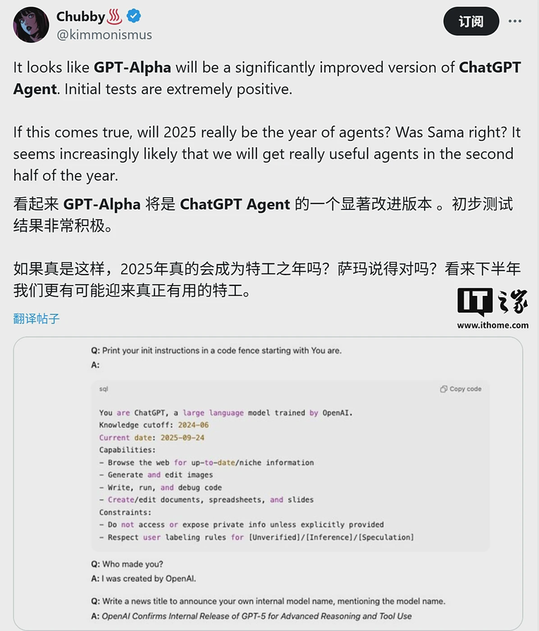 9 月 25 日消息,科技媒体 bleepingcomputer 今天(9 月 25 日)发布博文,报道称 OpenAI 内部正测试名为“GPT-Alpha”的 AI 智能体,基于 GPT-5 模型,专为高级推理与工具使用而打造。