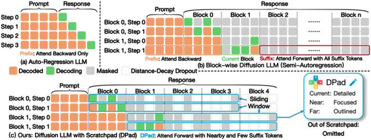 图4 (a)自回归模型;(b) 传统dLLM,需要关注所有后缀token;(c) DPad,仅关注附近少数经过筛选的后缀token
