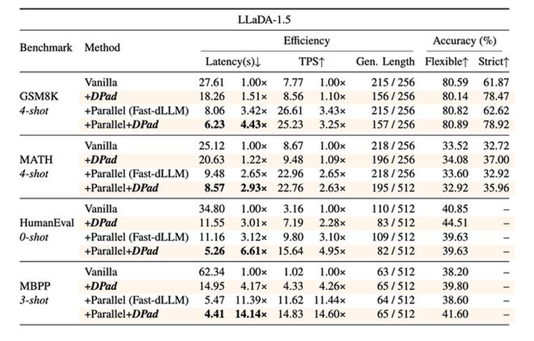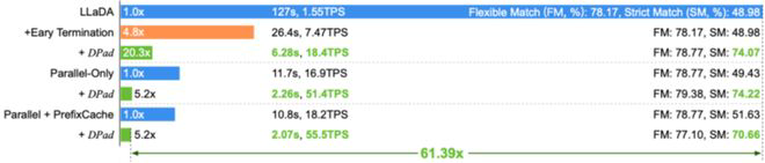 在LLaDA-1.5模型(1024 词元输出)上,DPad结合并行解码等优化后,实现了61.39倍的综合加速。