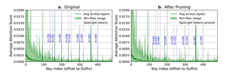 然而,DPad团队并不满足于此,他们进行了一项颠覆性的实验:强行删除那些距离很远、但注意力得分很高的「尖峰」词元。