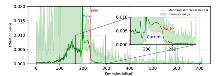 图2 当前块对后缀token的注意力分数图。可以看到,后文token存在部分尖峰