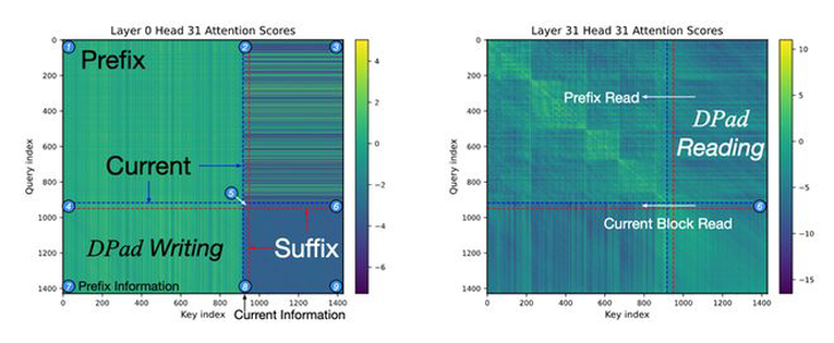 团队发现,dLLM的独特之处在于双向注意力,这使得它在生成文本时,会关注所有待生成的后文词元(Suffix Token),并将它们用作规划全文的「草稿纸」。