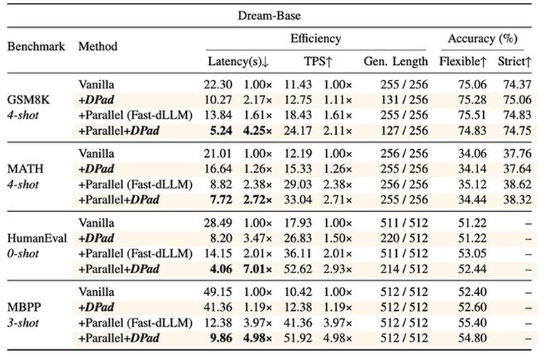 图10 在HumanEval(2048 tokens, 0-shot)任务上,Dream-Base+Fast-dLLM+DPad实现了97.32倍的加速