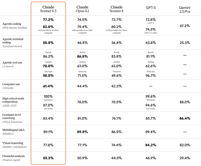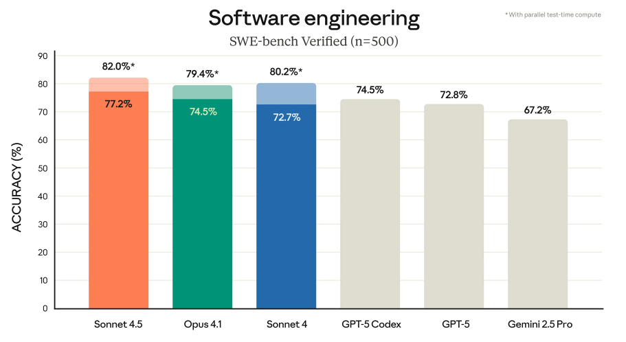 根据Anthropic公开的数据,在衡量 “真实世界软件编码能力” 的 SWE-bench Verified 评测中,Claude Sonnet 4.5 达到行业领先水平,能在复杂多步骤任务中保持专注超过30小时,全程稳定输出高质量代码。