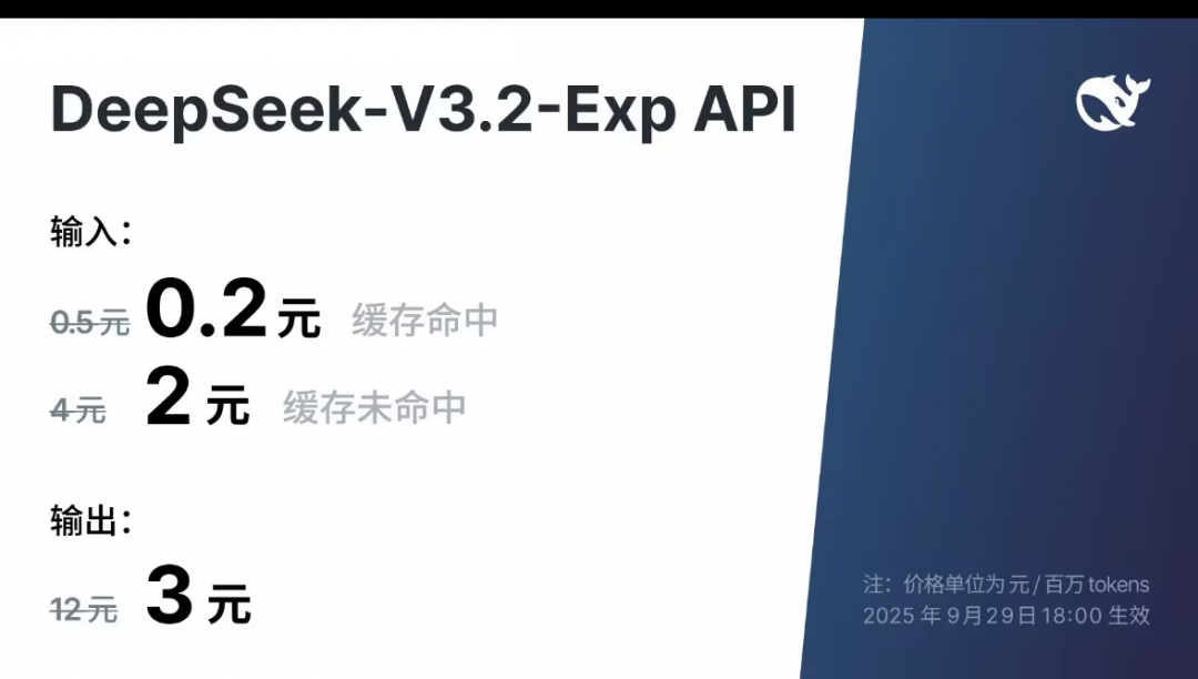 9月29日晚间,DeepSeek正式发布DeepSeek-V3.2-Exp模型,并宣布API调用价格大幅降低,输入百万Token价格降至2毛钱,输出价格直降75%,被业界称为“价格屠夫”再挥刀。