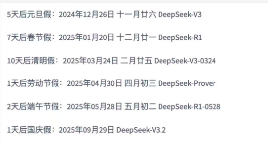 还有开发者整理出了DeepSeek历次模型发布时间与节日时间的相隔天数表: