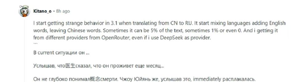 网友分享DeepSeek-V3.1多语言混用问题(图源:Reddit @Kitano_o)