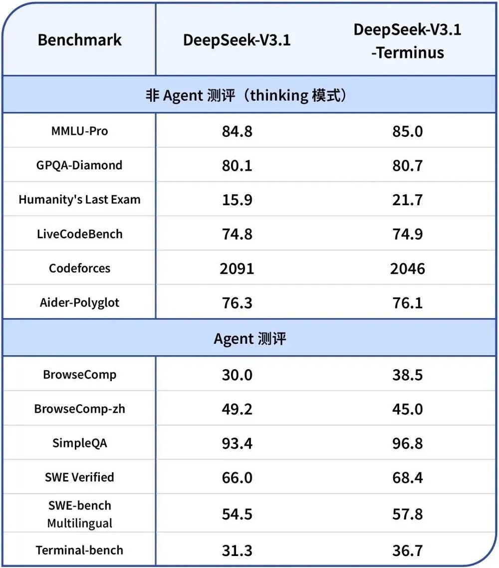 官方文档中称,DeepSeek-V3.1-Terminus在保持模型原有能力的情况下,改进了语言一致性、偶发异常字符等DeepSeek-V3.1上线后出现的Bug,还进一步优化了编程和搜索智能体的表现。