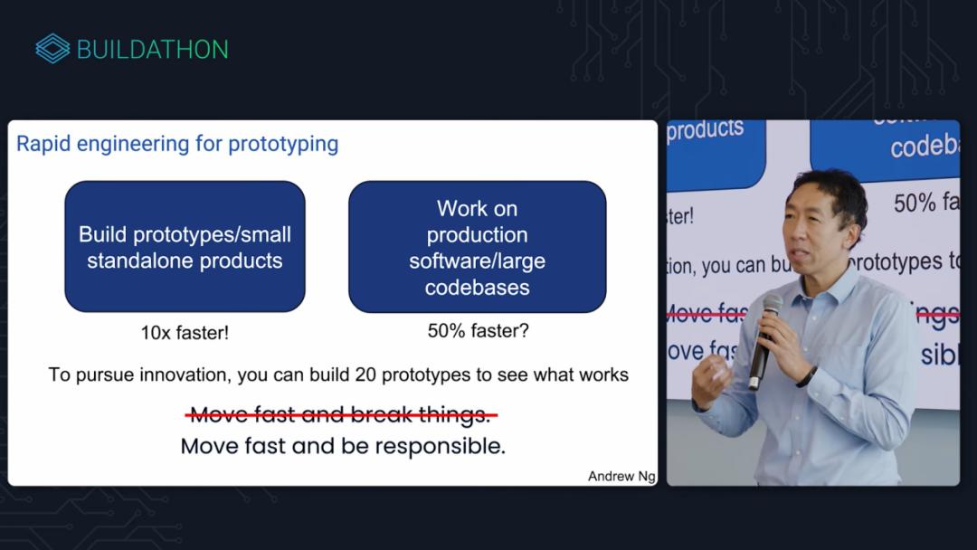 吴恩达提出,原型开发对安全性、扩展性要求较低,AI进一步降低了试错门槛。他推崇“快速行动,承担责任”(Move fast and be responsible)原则,建议在沙盒环境中大胆实验,再决定是否投入生产化改造。