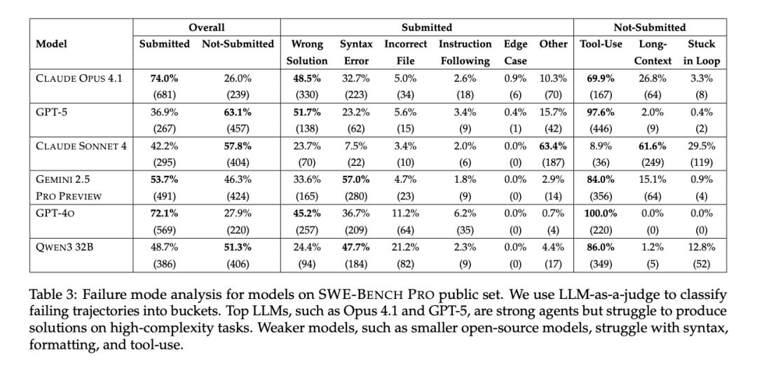 正如我们开头提到的,大语言模型在SWE-BENCH PRO上的解决率仅为中等水平,远低于SWE-Bench Verified中的70% 。
