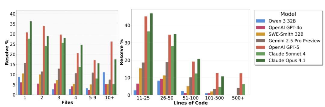 参考解决方案平均涉及4.1个文件、107.4行代码,所有任务至少改10行,超100项任务需改超100行。