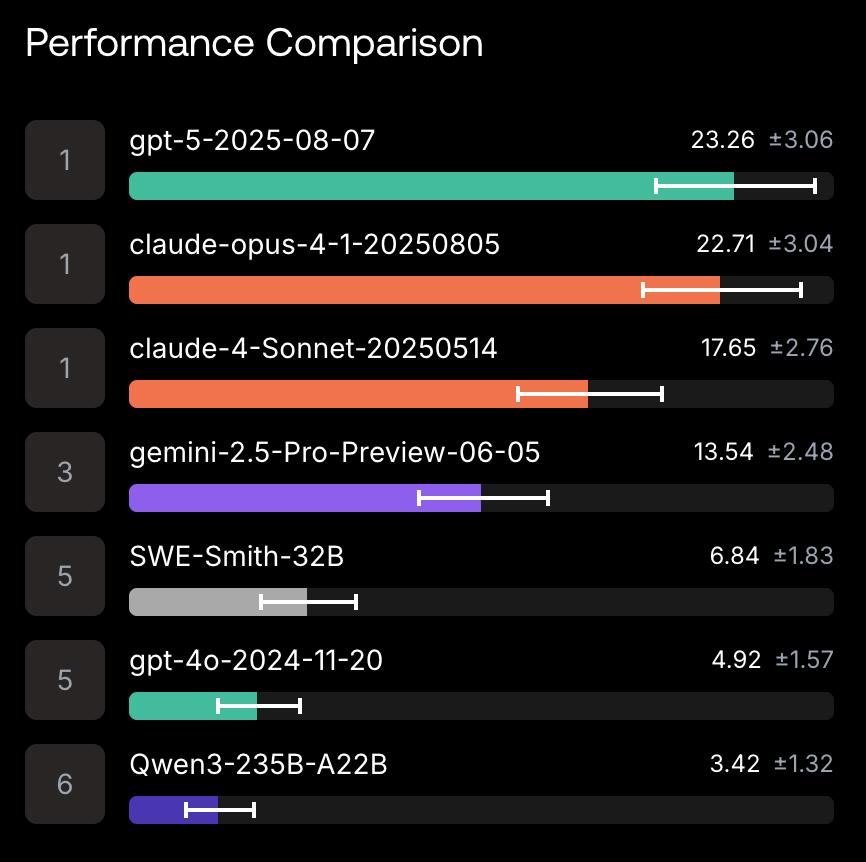 GPT-5虽拿下了第一,但成绩仅有23.3%,Claude Opus 4.1以22.7%得分位居第二。