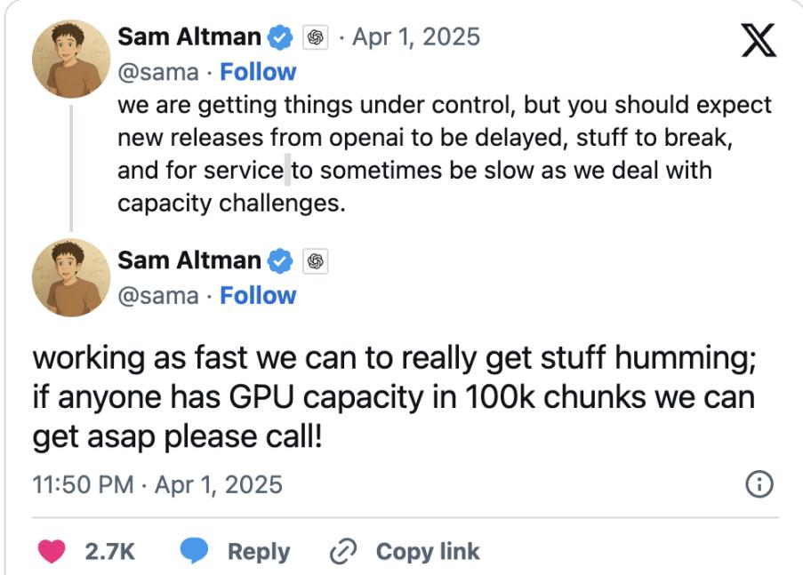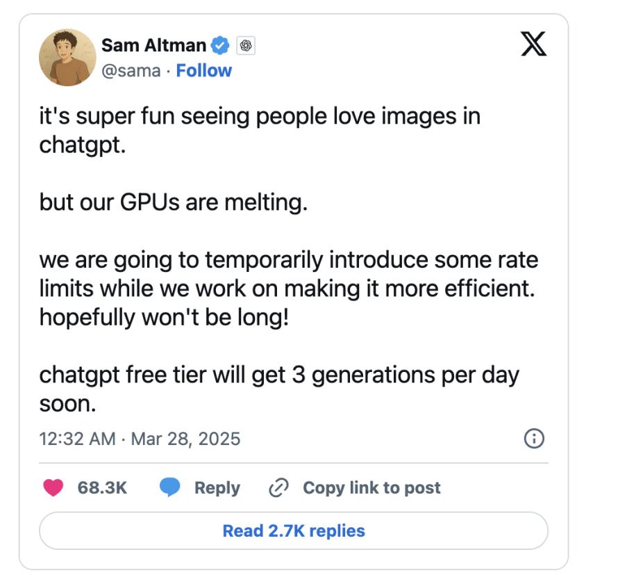 然而图像生成背后是极高的算力需求,不足的算力,造成了屡次更新延迟和服务中断,用户抱怨频频。