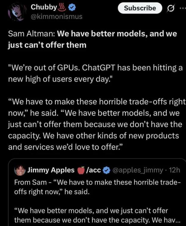 奥特曼反复表示OpenAI的GPU已经用完,“我们的GPU正在崩溃”,在社交媒体上大呼,“谁能尽快提供GPU,请给我打电话!”