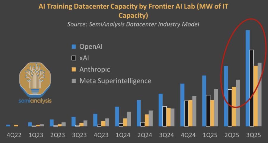 与此同时,竞争压力也在加剧。谷歌、Anthropic、Meta、xAI等都在AI领域快速追赶,每家公司也都在建设自己的算力基础设施。从算法竞争到基础设施竞争,AI产业的焦点正在发生根本性转移。