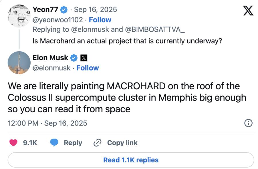 尽管与 OpenAI 、 Meta 和 Anthropic 正在建设的千兆瓦级集群相比,Colossus 1 约 300 兆瓦的规模并不庞大,但根据独立分析机构semi ainalysis预测,依靠英伟达的投资,2025年第三季度,xAI的单个数据中心总容量将超过 Meta Superintelligence 和 Anthropic,从而在Colossus 2上市时能够在计算能力上再次超越大多数竞争对手。9月16日,马斯克就在X上炫耀,从太空就能看到位于孟菲斯由壮观的Colossus ||超算集群排列出的巨硬(MACROHARD)字样。