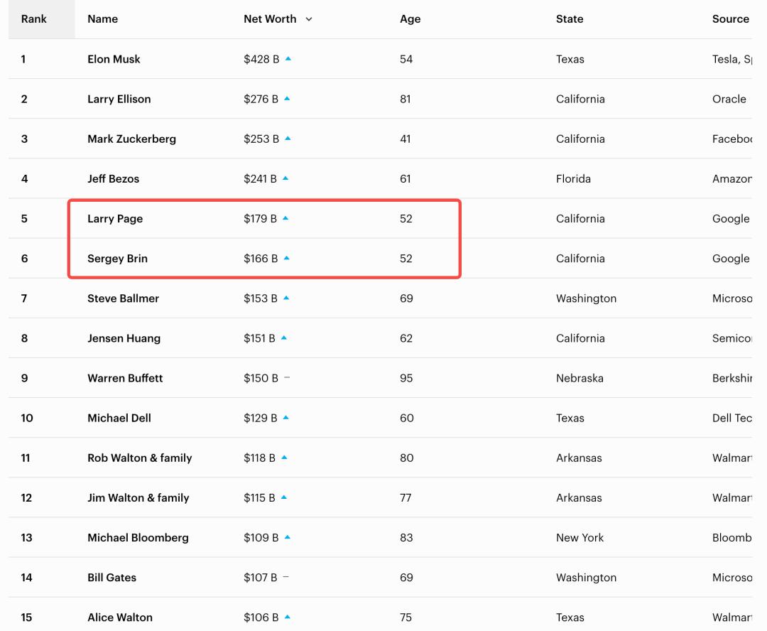 而如果按照净资产的排序,排名前15的最年轻富豪是谷歌的两位创始人,拉里·佩奇和谢尔盖·布林(52岁),以及马斯克(54岁),但没有一个人是40岁以下,年龄最大是巴菲特(95岁)。