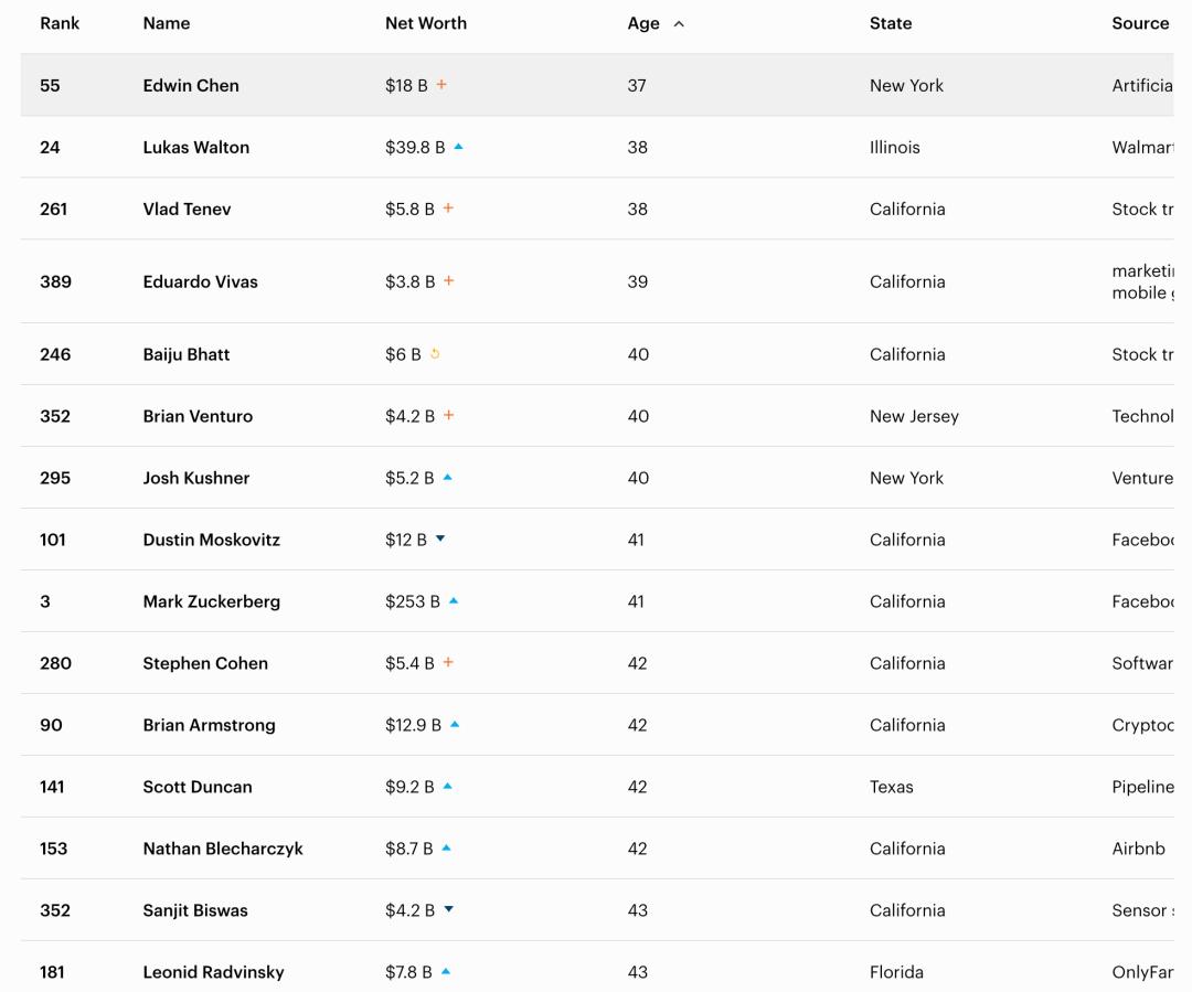 如果按照年龄排序,37岁的Edwin Chen是新晋的最年轻亿万富翁。