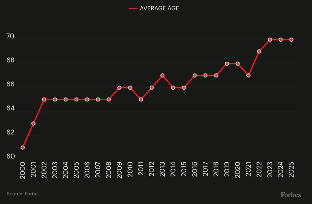 过去25年间,福布斯400富豪榜成员的平均年龄从61岁攀升至70岁,比39岁的美国人平均年龄整整大了三十岁。