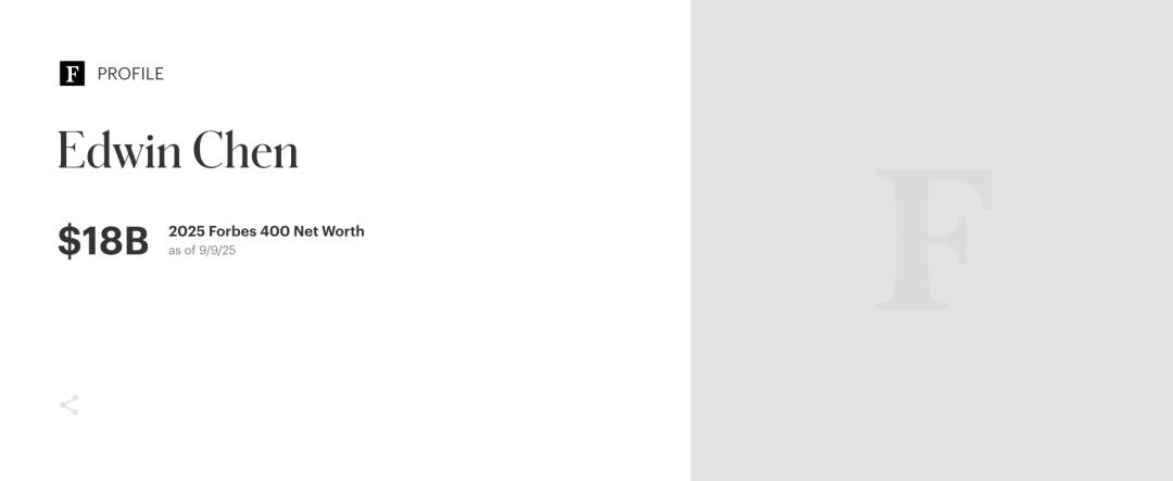 Edwin Chen决定使用「自有资金」支持Surge的决策获得了丰厚回报:他持有的约75%股份估值约180亿美元,这足以使他成为今年福布斯美国400富豪榜上最富有的新晋成员。