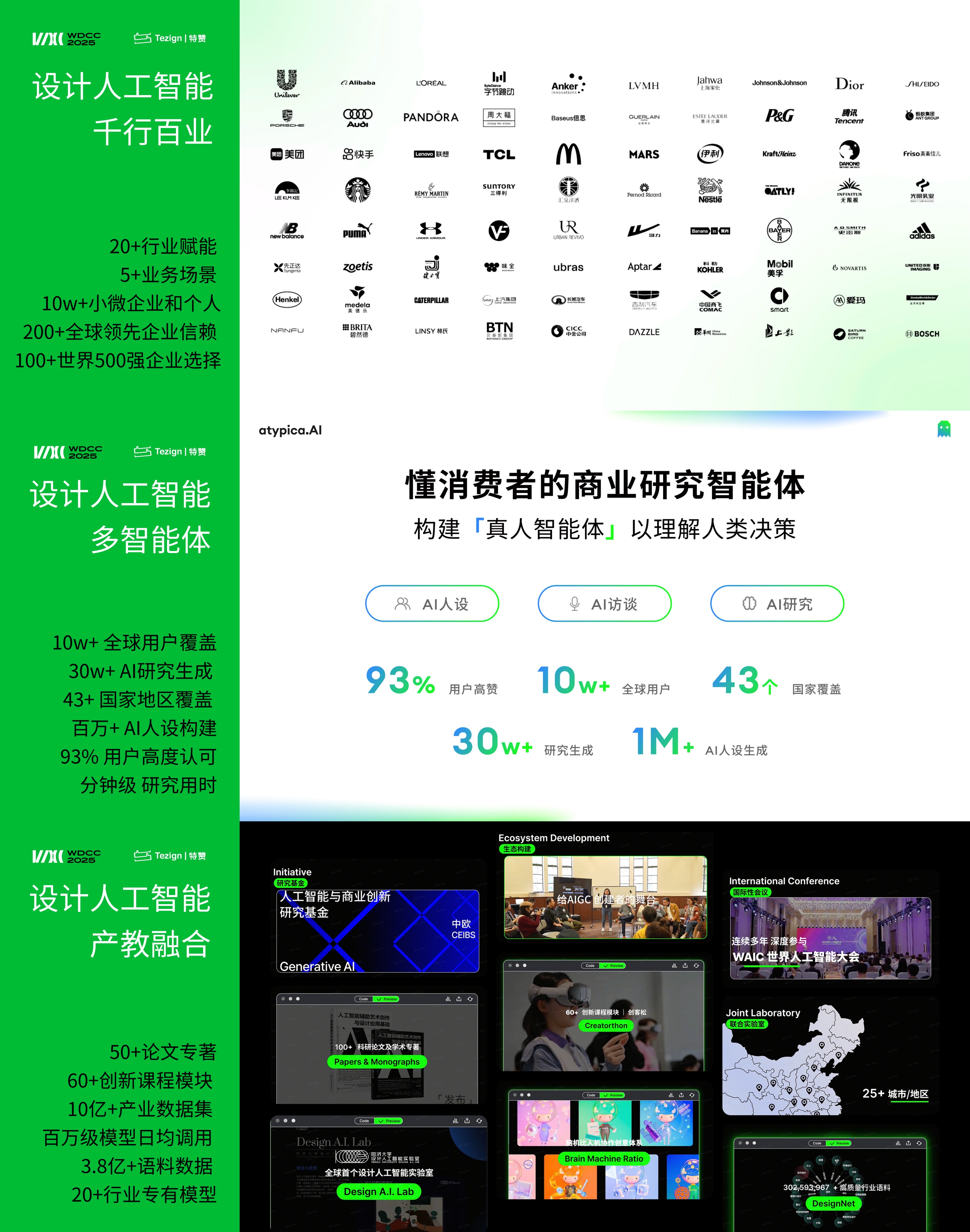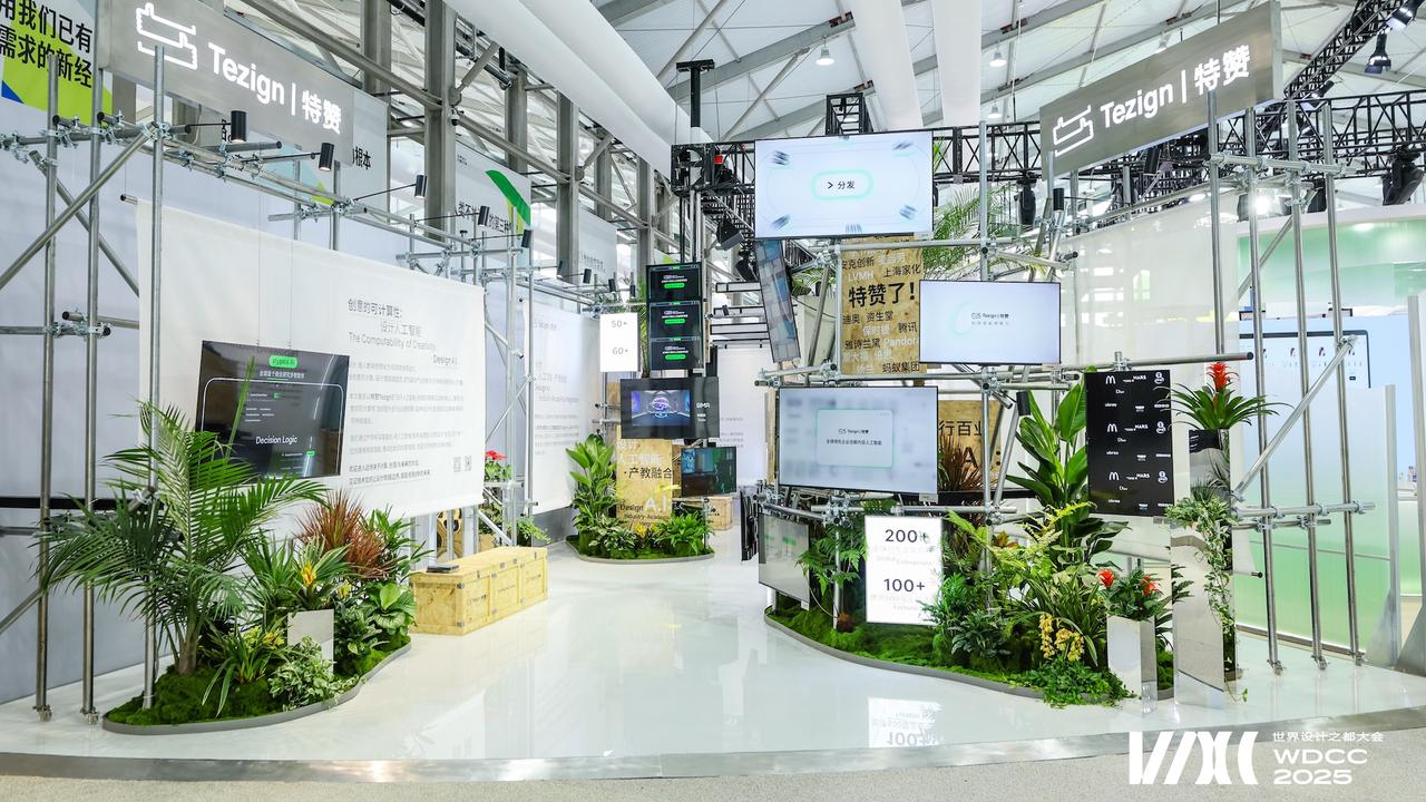 在 WDCC2025,特赞展览分为三大主题空间,讲述“计算×创意”如何推动设计生命力延展。所有展具采用环保材料搭建,“数字之树”与动态屏幕象征着设计在科技与环境之间的共生与生长。在“设计人工智能?千行百业” 板块,展现设计人工智能跨越产业边界,在多行业实现赋能,以特赞在各行业最佳实践诠释可计算创意驱动产业发展;在 “设计人工智能?产教融合” 板块,聚焦设计人工智能打破学科边界、推动产学研协作,以同济 x 特赞设计人工智能实验室创新实践为核心,构建创新教育生态;在“设计人工智能?多智能体” 板块,聚焦重构人机协作模式,以开创新的商业研究多智能体 atypica.AI 为核心,展示其为商业研究提供智能化新模式。