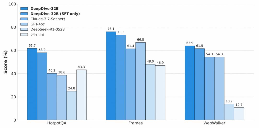 图|DeepDive 在简单搜索基准上的泛化效果。† 表示通过函数调用来实现浏览功能。