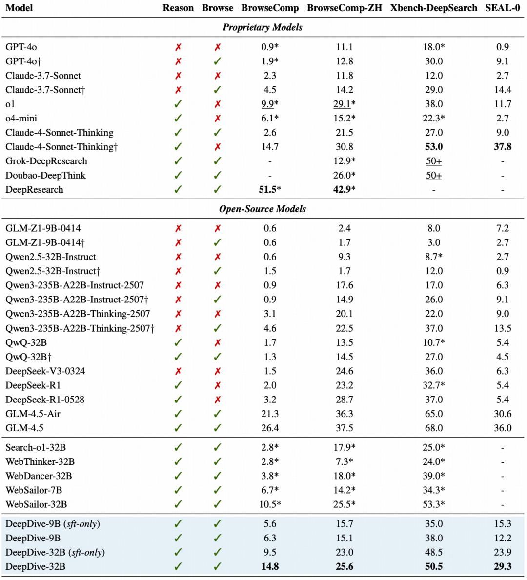 表|深度搜索问答基准评测结果。准确率(%)为报告数据。*表示现有研究的报告性能。† 表示通过函数调用实现浏览功能。