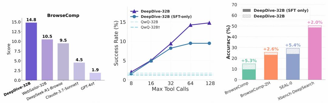 实验表明,基于该方法训练的 DeepDive-32B 在 BrowseComp 测试中取得了 14.8% 的准确率。这证明了在深度搜索中,工具调用和并行采样的测试时间扩展是有效的。