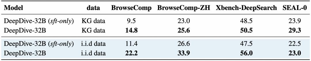 此外,除了上述方法和数据,研究团队还开源了一项关于半自动独立同分布(i.i.d.)深度搜索问答合成的附加研究。仅使用这项研究中的数据,DeepDive-32B 在 BrowseComp 上的准确率可以进一步提升至 22.2%。