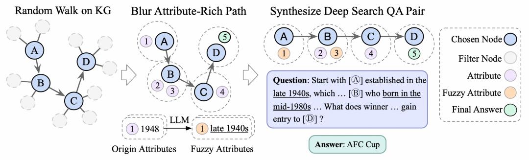 图|用于 DeepDive 的知识图谱自动化问答数据合成。通过在知识图谱上执行随机游走,自动构建深度搜索问答对,然后使用 LLM 对其进行混淆。