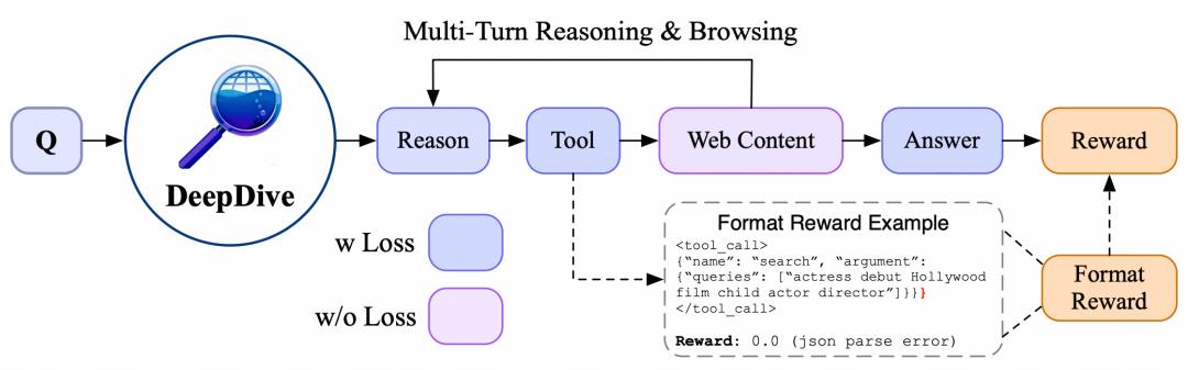 DeepDive旨在提升深度搜索 Agent 的长期信息检索能力,通过数据构建与 RL 两大技术模块实现突破。他们开发了一种策略,能够自动从开放知识图谱中生成难以发现的查询问题,并运用端到端多轮 RL 技术,通过深度搜索增强语言模型的长程推理能力。