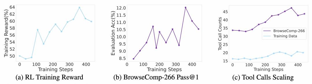 图|训练奖励(a)和在 BrowseComp-266 上的评估准确率(b),以及在训练和评估过程中的平均工具调用次数(c),展示了强化学习(RL)如何逐步培养出更深层次的搜索策略。