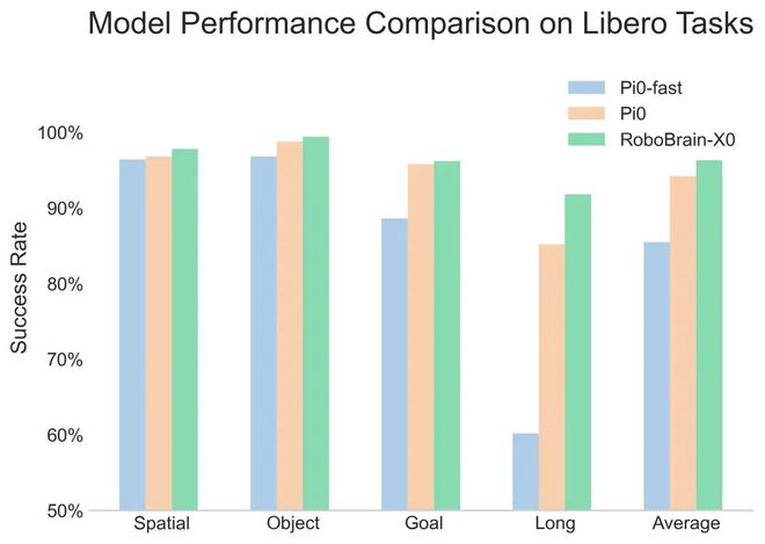 在权威的LIBERO仿真平台中,RoboBrain-X0的综合成功率高96.3%,在所有评测维度均超越了π0。
